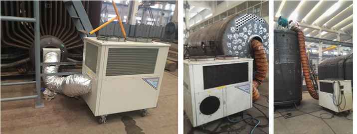 解决方案:使用SAC-80B工业冷气机及SAC-140工业冷气机等大机型,在进行锅炉烧焊工作时把冷风管延伸至桶身内部,对桶身这一相对密闭空间进行降温