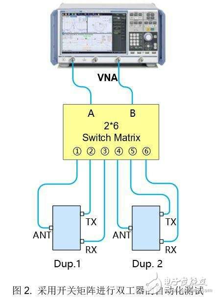 图2显示了采用2&TImes;6开关矩阵进行双工器测试的系统连接图,其中网络分析仪通过开关矩阵后变成了“6端口”。